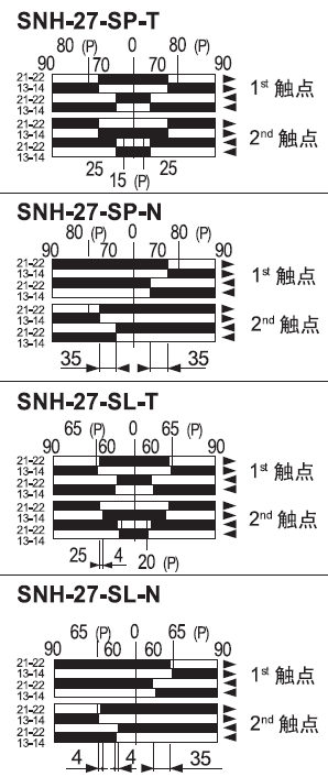 规格: 环境空气湿度:工作-25~70℃,储存:-40~70℃ 耐振动:9gn(10-500hz)符合IEC68-2-6 耐冲击性:68gn符合IEC68-2-27 防触电保护:I类符合IEC536 和NFC20-030 防护等级:IP54 机械寿命:200万次 最小动作力: 开关触发:0.45N.m(SNH-07/17/04),0.60N.m(SNH-27), 1N.m(SNH-37) 强制开离工作:0.75N.m(SNH-07/17/04),0.70 N.m (SNH-27),1N.m(SNH-37) 最大触发速度:1.5m/s 额定工作电压/电流:AC-15:A600 ( Ue=240v,Ie=3A) DC-13:Q300 ( Ue=250V,Ie=0.27A) 符合IEC947-5-1附录A.EN60947-5-1 额定绝缘电压:Ui=600V污染等级3,符合IEC947-1和VDE0110. Ui=600V符合UL508,CSA C22-2 n 14 额定冲击耐受电压:Uimp=6kv 符合IEC947-1,IEC664 强制开离功能:常闭触点带强制开离功能符合IEC947-5-1 section 3,EN60947-5-1 短路保护:10A保险丝 螺纹孔:1/2NPT,M20X1.5,PG13.5 接线方式:螺丝夹紧接线端子,电线规格最小:1*0.5平方毫米,最大2*2.5平方毫米 |