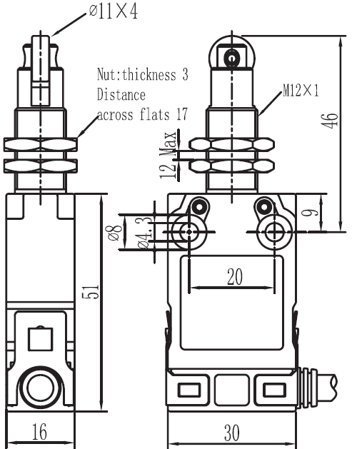 规格: 操作速度: 0.05mm-2m/sec 操作频率: 机械:120ops/min 电气: 30ops/min 绝缘电阻:: >100MΩ @ 500V DC 额定封闭发热电流: 10A (EN60947-5-1) 电气等级: UL/cUL Listed(E216958) for AC15 A300/ DC13 Q300 耐压值: 同级端子间1000VAC 50/60Hz 1分钟 子对地或对无载金属间2500VAC 50/60Hz 1分钟 寿命: 机械 10,000,000次, 电气500,000次 环境温度: -25~80℃(-13~176 oF) 不结冰 电缆: SM31(5芯,0.75平方毫米 7芯,0.5平方毫米 9芯,0.34平方毫米SM31N(4芯,0.5平方毫米) 保护等级: IP67 |