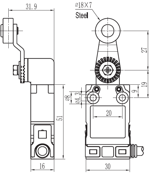 规格: 操作速度: 0.05mm-2m/sec 操作频率: 机械:120ops/min 电气: 30ops/min 绝缘电阻:: >100MΩ @ 500V DC 额定封闭发热电流: 10A (EN60947-5-1) 电气等级: UL/cUL Listed(E216958) for AC15 A300/ DC13 Q300 耐压值: 同级端子间1000VAC 50/60Hz 1分钟 子对地或对无载金属间2500VAC 50/60Hz 1分钟 寿命: 机械 10,000,000次, 电气500,000次 环境温度: -25~80℃(-13~176 oF) 不结冰 电缆: SM31(5芯,0.75平方毫米 7芯,0.5平方毫米 9芯,0.34平方毫米SM31N(4芯,0.5平方毫米) 保护等级: IP67 |