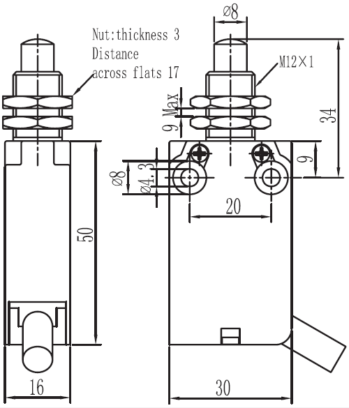 规格: 操作速度: 0.05mm-2m/sec 操作频率: 机械:120ops/min 电气: 30ops/min 绝缘电阻:: >100MΩ @ 500V DC 额定封闭发热电流: 10A (EN60947-5-1) 电气等级: UL/cUL Listed(E216958) for AC15 A300/ DC13 Q300 耐压值: 同级端子间1000VAC 50/60Hz 1分钟 子对地或对无载金属间2500VAC 50/60Hz 1分钟 寿命: 机械 10,000,000次, 电气500,000次 环境温度: -25~80℃(-13~176 oF) 不结冰 电缆: SM31(5芯,0.75平方毫米 7芯,0.5平方毫米 9芯,0.34平方毫米SM31N(4芯,0.5平方毫米) 保护等级: IP67 |