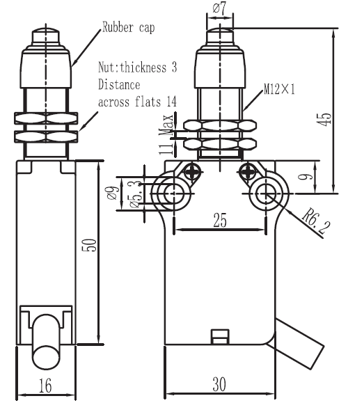 规格: 操作速度: 0.05mm-2m/sec 操作频率: 机械:120ops/min 电气: 30ops/min 绝缘电阻:: >100MΩ @ 500V DC 额定封闭发热电流: 10A (EN60947-5-1) 电气等级: UL/cUL Listed(E216958) for AC15 A300/ DC13 Q300 耐压值: 同级端子间1000VAC 50/60Hz 1分钟 子对地或对无载金属间2500VAC 50/60Hz 1分钟 寿命: 机械 10,000,000次, 电气500,000次 环境温度: -25~80℃(-13~176 oF) 不结冰 电缆: SM32(5芯,0.75平方毫米 7芯,0.5平方毫米 9芯,0.34平方毫米SM32N(4芯,0.5平方毫米) 保护等级: IP67 |