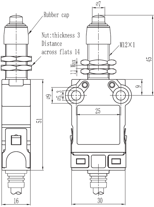 规格: 操作速度: 0.05mm-2m/sec 操作频率: 机械:120ops/min 电气: 30ops/min 绝缘电阻:: >100MΩ @ 500V DC 额定封闭发热电流: 10A (EN60947-5-1) 电气等级: UL/cUL Listed(E216958) for AC15 A300/ DC13 Q300 耐压值: 同级端子间1000VAC 50/60Hz 1分钟 子对地或对无载金属间2500VAC 50/60Hz 1分钟 寿命: 机械 10,000,000次, 电气500,000次 环境温度: -25~80℃(-13~176 oF) 不结冰 电缆: SM32(5芯,0.75平方毫米 7芯,0.5平方毫米 9芯,0.34平方毫米SM32N(4芯,0.5平方毫米) 保护等级: IP67 |