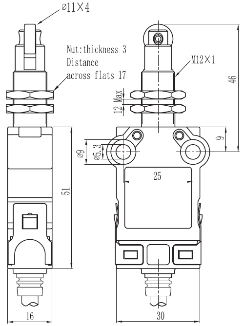 规格: 操作速度: 0.05mm-2m/sec 操作频率: 机械:120ops/min 电气: 30ops/min 绝缘电阻:: >100MΩ @ 500V DC 额定封闭发热电流: 10A (EN60947-5-1) 电气等级: UL/cUL Listed(E216958) for AC15 A300/ DC13 Q300 耐压值: 同级端子间1000VAC 50/60Hz 1分钟 子对地或对无载金属间2500VAC 50/60Hz 1分钟 寿命: 机械 10,000,000次, 电气500,000次 环境温度: -25~80℃(-13~176 oF) 不结冰 电缆: SM32(5芯,0.75平方毫米 7芯,0.5平方毫米 9芯,0.34平方毫米SM32N(4芯,0.5平方毫米) 保护等级: IP67 |