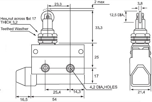 规格: 操作速度: 0.05mm-0.5m/sec 操作频率: 机械:120ops/min 电气: 30ops/min 绝缘电阻: >100MΩ @ 500V DC 接点电阻: <15mΩ(初值) 额定封闭发热电流: 10A/250V AC (EN60947-5-1) 电气等级: UL/cUL Listed(E216958) for AC15 A600/ DC13 Q300 耐压值: 同级端子间1000VAC 50/60Hz 1分钟 端子对地或对无载金属间2000VAC 50/60Hz 1分钟 寿命: 机械10,000,000次, 电气 500,000次 环境温度: -20 to +60°C (-4 to 140oF) 湿度: <95%RH 防护等级: IP64(IP67 加后缀为-W) |