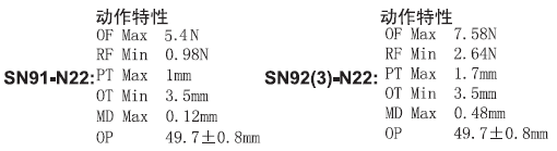 规格: 操作速度: 0.02mm-0.5m/sec 操作频率: 机械:120ops/min 电气: 30ops/min 绝缘电阻: >100MΩ @ 500V DC 接点电阻: <25mΩ(初值) 额定电流电压(UL编号:E240199): SN91:15A,125/250/480VAC:0.75HP/125VAC or 1.5HP/250VAC SN92:20A,125/250/480VAC:1.5HP/125VAC or 2HP/250VAC SN93:25A,125/250/480VAC:1.5HP/125VAC or 2HP/250VAC 电气等级: UL/cUL Listed(E216958) for AC15 A600/ DC13 Q300 耐压值: 同级端子间1000VAC 50/60Hz 1分钟 端子对地或对无载金属间2500VAC 50/60Hz 1分钟 寿命: 机械10,000,000次, 电气 500,000次 环境温度: -25 ~ +80°C (-13 to 176oF) 湿度: <95%RH 防护等级: IP66/IP60 |