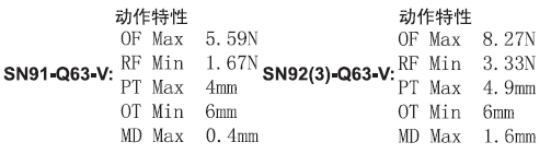规格: 操作速度: 0.02mm-0.5m/sec 操作频率: 机械:120ops/min 电气: 30ops/min 绝缘电阻: >100MΩ @ 500V DC 接点电阻: <25mΩ(初值) 额定电流电压(UL编号:E240199): SN91:15A,125/250/480VAC:0.75HP/125VAC or 1.5HP/250VAC SN92:20A,125/250/480VAC:1.5HP/125VAC or 2HP/250VAC SN93:25A,125/250/480VAC:1.5HP/125VAC or 2HP/250VAC 电气等级: UL/cUL Listed(E216958) for AC15 A600/ DC13 Q300 耐压值: 同级端子间1000VAC 50/60Hz 1分钟 端子对地或对无载金属间2500VAC 50/60Hz 1分钟 寿命: 机械10,000,000次, 电气 500,000次 环境温度: -25 ~ +80°C (-13 to 176oF) 湿度: <95%RH 防护等级: IP66/IP60 |