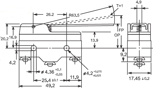 规格: 操作速度: 0.01mm-1m/sec 操作频率: 机械:240ops/min 电气: 20ops/min 绝缘电阻: >100MΩ @ 500V DC 接点电阻: <15mΩ 额定电流/电压: 15A,125/250/480VAC;3/4HP/125VAC 1.5HP/250VAC(UL:E321073) 耐压值: 同级端子间1000VAC 50/60Hz 1分钟 端子对地或对无载金属间2500VAC 50/60Hz 1分钟 寿命: 机械 10,000,000次, 电气500,000次 环境温度: -40 to +80°C (-40 to 176°F) 不结冰 湿度: <95%RH 防护等级: 一般型:IP00 防滴型(-55后缀):IP64 |