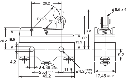 规格: 操作速度: 0.01mm-1m/sec 操作频率: 机械:240ops/min 电气: 20ops/min 绝缘电阻: >100MΩ @ 500V DC 接点电阻: <15mΩ 额定电流/电压: 15A,125/250/480VAC;3/4HP/125VAC 1.5HP/250VAC(UL:E321073) 耐压值: 同级端子间1000VAC 50/60Hz 1分钟 端子对地或对无载金属间2500VAC 50/60Hz 1分钟 寿命: 机械 10,000,000次, 电气500,000次 环境温度: -40 to +80°C (-40 to 176°F) 不结冰 湿度: <95%RH 防护等级: 一般型:IP00 防滴型(-55后缀):IP64 |