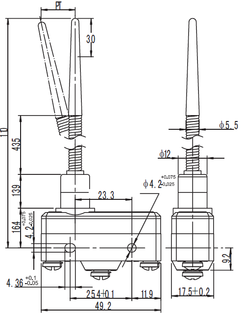规格: 操作速度: 0.01mm-1m/sec 操作频率: 机械:240ops/min 电气: 20ops/min 绝缘电阻: >100MΩ @ 500V DC 接点电阻: <15mΩ 额定电流/电压: 15A,125/250/480VAC;3/4HP/125VAC 1.5HP/250VAC(UL:E321073) 耐压值: 同级端子间1000VAC 50/60Hz 1分钟 端子对地或对无载金属间2500VAC 50/60Hz 1分钟 寿命: 机械 10,000,000次, 电气500,000次 环境温度: -40 to +80°C (-40 to 176°F) 不结冰 湿度: <95%RH 防护等级: 一般型:IP00 防滴型(-55后缀):IP64 |