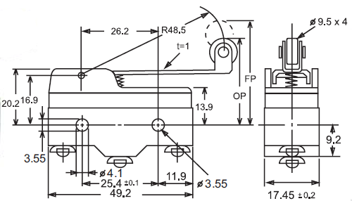 规格: 操作速度: 0.01mm-1m/sec 操作频率: 机械:240ops/min 电气: 20ops/min 绝缘电阻: >100MΩ @ 500V DC 接点电阻: <15mΩ(初值) 额定电流/电压: 10A ,1/2HP 125/250VAC,2A 480VAC; 0.5A 125VDC,0.25A 250VDC 耐压值: 同级端子间1000VAC 50/60Hz 1分钟 端子对地或对无载金属间1500VAC 50/60Hz 1分钟 寿命: 电气 1,000,000次, 机械 500,000次 环境温度: -25 to +105°C (-13 to 221°F) 不结冰 湿度: 35%~85%RH 防护等级: 一般型:IP00 防滴型(-55后缀):IP62 |