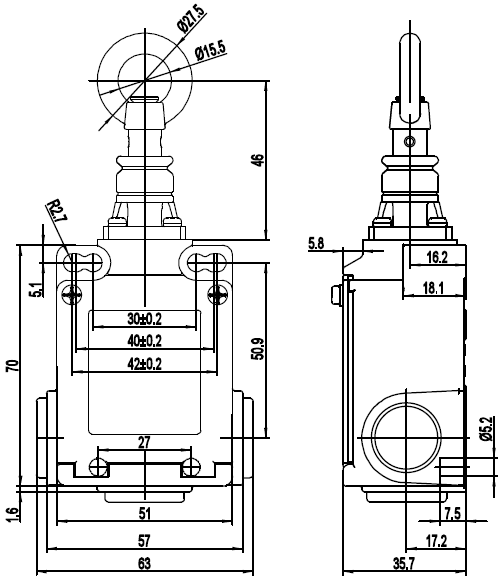 规格: 操作速度: 0.05mm-2m/sec 操作频率: 机械:120ops/min 电气: 30ops/min 绝缘电阻: >100MΩ @ 500V DC 接点电阻: <25mΩ 额定电流/电压: 10A/600V (EN60947-5-1) 电气等级: UL/cUL Listed(E216958) for AC15 A600/ DC13 Q300 耐压值: 同级端子间1000VAC 50/60Hz 1分钟 端子对地或对无载金属间2500VAC 50/60Hz 1分钟 寿命: 机械 10,000,000次, 电气500,000次 环境温度: -25 to +80°C (-13 to 176oF) 湿度: <95%RH 防护等级: IP67 |