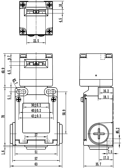 规格: 操作速度: 0.05mm-2m/sec 操作频率: 机械:120ops/min 电气: 30ops/min 绝缘电阻: >100MΩ @ 500V DC 接点电阻: <25mΩ 额定电流/电压: 10A/600V AC (EN60947-5-1) 电气等级: AC15 A600/ DC13 Q300 耐压值: 同级端子间1000VAC 50/60Hz 1分钟 端子对地或对无载金属间2500VAC 50/60Hz 1分钟 寿命: 机械 10,000,000次, 电气500,000次 环境温度: -25 to +80°C (-13 to 176oF) 湿度: <95%RH 防护等级: IP67/ IP66 钥匙安全门开关 |